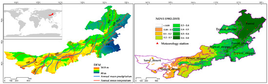 Spatial distribution of annual precipitation and mean temperature (left), and different vegetation types and mean normalized difference vegetation index (NDVI) in Inner Mongolia during 1982–2015 (right).