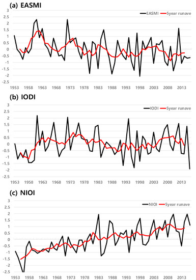 Time series of normalized (a) EASMI, (b) IODI and (c) NIOI for 1953–2016. Black line represents each index and red line displays their 5-year (from year −2 to year +2 period) running average.