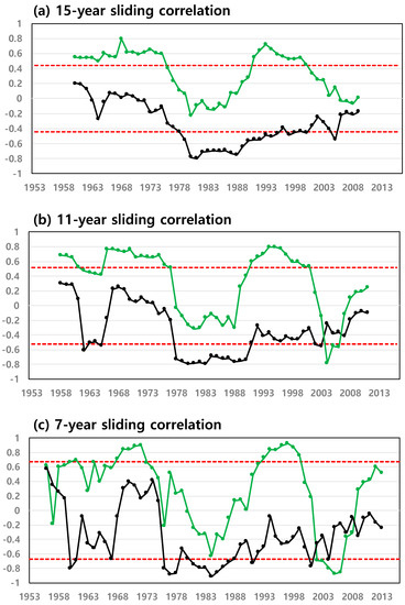 Sliding correlations with (a) 15-year (from year −7 to year +7 period), (b) 11-year (from year −5 to year +5 period) and (c) 7-year (from year −3 to year +3 period) sliding windows between EASMI and indices of the tropical IO SSTA (Black line: NIOI, Green line: IODI line). The dashed red lines represent the significance at the 90% confidence level with the Student’s t-test in each window length.