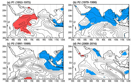 Correlation distributions of the high pass filtered summer SSTA in the tropical IO with the EASMI in (a) 1953–1975, (b) 1979–1990, (c) 1991–1999, (d) 2000–2016. The contour interval is 0.1 and shading (Red: positive, Blue: negative) shows the significance at the 90% confidence level with the Student’s t-test in each period.