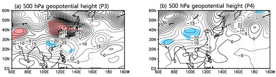 Because the ENSO plays a key role in linking the atmosphere-ocean coupled system with interannual variability mode [16], the low-frequency (LF)-type and the quasi-biennial (QB)-type ENSOs, which have been classified in many previous studies [39,40,41], two types ENSOs are analyzed in terms of association to EASMI for other possible causes. To investigate the change in climate circulation influenced by El Niño events, we show the summertime 850 hPa geopotential height and SSTA corresponding to the composite differences between P3 and P4 (Figure 8). We explore composite differences instead of those only during the ENSO events to prevent losing data. Besides, the interannual variability of circulation over the Pacific is affected dominantly and described by ENSO events. Therefore, Figure 8b is very similar to the composite difference pattern in the Pacific during El Niño events of 2000–2016 (P4) and 1991–1999 (P3) (not shown). The 850 hPa height represents strengthened North Pacific subtropical high and significantly weakened WNPSH (Figure 8a). Besides, there are significant warming over the middle- and higher-latitude Pacific and tropical IO, except for the tropical eastern Pacific including parts of the central Pacific (Figure 8b). Furthermore, even in the previous wintertime, the composite difference of SSTA does not show specific significant patterns in the tropical eastern IO and central IO (not shown). In other words, the changes in Central Pacific-El Niño/Eastern Pacific-El Niño are not outstanding for 1991–1999 (P3) and 2000–2016 (P4). Instead, the summer atmospheric circulation opposite to those shown in Figure 8a has been observed when a warm LF-type ENSO event is dominant [42], Figure 2f. Thus, the LF ENSO is associated with the obvious distinction in the Pacific during P3 and P4. Moreover, the atmospheric circulation patterns when the LF- and QB- type ENSO are dominant are similar to those reflected by EASMI during P3 (Figure 4a,c) and P4 (Figure 4b,d), respectively [42], Figure 2e,f.