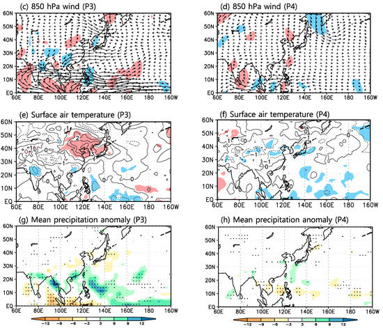 In contrast, during the period of P4 (2000–2016), the regression patterns show distinctly different features from those of the period P3 (1991–1999). The tripolar pattern of the regressed 500 hPa geopotential height disappears and the negative anomalies appear over WNP and North Pacific (NP) region (Figure 4b). In particular, areas with negative anomalies in the WNP region are reduced in the zonal direction and the intensity of these significant anomalies decreases. At 850 hPa, only anomalous cyclones are observed over the WNP region and the anomalous anticyclone over Korea, Northeast China and Japan disappears. Furthermore, there is westerly wind in the region from eastern IO to the western Pacific (Figure 4d). However, the significant areas are reduced and their intensities seem to be weaker than those in P3 (Figure 4c). The regression pattern of the surface air temperature exhibits few significant patterns (Figure 4f). In the precipitation, the PJ pattern disappears and the dried areas expand to all of the India. In other words, the summer circulation patterns, which are related to EASMI, have completely different structures for 1991–1999 and 2000–2016, especially in the region encompassing Korea, Northeast China and Japan (Figure 4h).