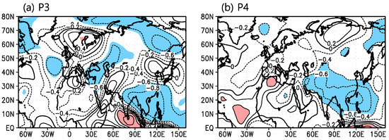 Correlation distributions of the high pass filtered summer stream function at 500 hPa with the EASMI in the Atlantic Ocean and Eurasia in (a) 1991–1999 (P3) and (b) 2000–2016 (P4). The contour internal is 0.2 and shading shows the significance at the 90% confidence level of the Student’s t-test.