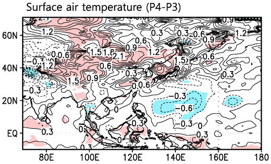 Composite differences of summertime surface air temperature (Unit: °C) of the periods P4 and P3. The values in the shaded area are significant at the 90% confidence level with the Student’s t-test.