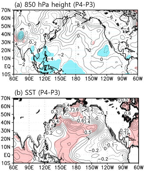 Composite differences of summertime (a) geopotential height at 850 hPa (Unit: gpm), (b) sea surface temperature (Unit: °C) of the periods P4 and P3. The values in the shaded areas are significant at the 90% confidence level with the Student’s t-test.
