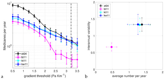 (a) Average number per year of detected Medicanes as a function of the sea level pressure gradient in the tracking algorithm. The average for each year is taken over the Medicane season, that is, the period from August to July of the following year. The dashed line indicates the value of 3.21 × hPa km commonly used in the literature and also in this study for the detection of Medicanes. (b) Scatter plot of the average number per year of Medicanes detected with a pressure gradient value of 3.21 × hPa km and interannual variability. The error bars represent the standard deviation of the distribution of values obtained by bootstrap resampling 10,000 time series starting from the original one.