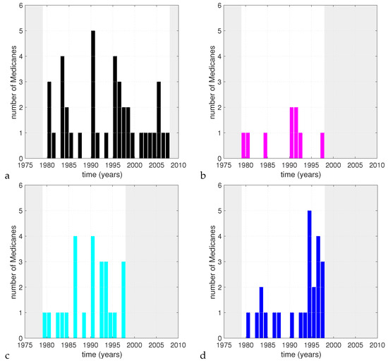 Time series of the number of detected Medicanes per Medicane season for G = 3.21 × hPa km in the et04 (a), bt11 (b), kt11 (c) and kw11 (d) simulations. The shaded areas indicate time periods outside the range of the simulations.