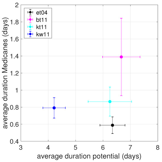 Scatter plot of the average duration of Medicanes, whole trajectory (horizontal axis) and Medicane state (vertical axis), for G = 3.21 × hPa km. The error bars are computed as the standard deviation of the durations of the individual trajectories divided by the square root of the number of the trajectories.