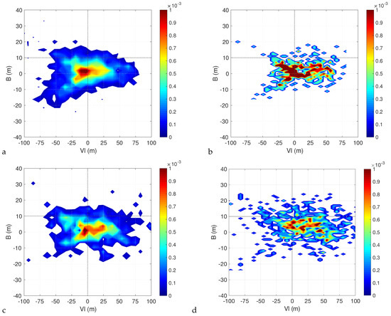 The characterization of the cyclone trajectories is completed by performing an analysis of the statistical properties of Medicanes in the Hart parameter space. For each simulation, we consider all the trajectories which have been classified as a Medicane at a certain point of their evolution. Each of them corresponds to a sequence of points in the two planes and . We compute, in each plane, the density of these points by gridding the plane with 50 bins in each direction between the minimum and maximum values taken by the parameters. Note that we include only the trajectories that, at a certain point, have become a Medicane, but we compute the densities using the whole trajectories.