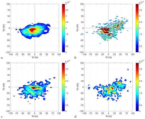 Once the minima at each time instant have been selected, a proximity condition is imposed in order to reconstruct the trajectories. Starting from time for each minimum at time t, we check if there is a minimum at time which is closer than , with km h and h. In that case, the two minima are considered to belong to the same trajectory. We verified that thanks to the filtering and the selection described above, no inconsistencies (for example, two minima at time both possible successors of one single minimum at time t) were found.