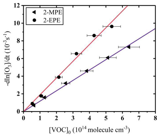 Absolute measurements. As described above, six runs were conducted in the case of different initial substrate concentrations under pseudo-first-order conditions. In all experiments, the decline of O3 concentration was obtained as a function of reaction time and the ln([O3]0/[O3]) values were plotted for different reaction times (see Figure S1 (1,2)). The experimental condition details are listed in Table S1. As shown in Figure S1, straight lines were obtained for all pseudo-first-order plots. All lines have excellent correlation coefficients (>0.998). Besides, it was evidenced that the ozonolysis of the main products detected hereinafter do nto likely compete with the parent reaction. This demonstrates that Equation (1) is suitable for the kinetic study in this work. This is in line with a previous study based on absolute measurements [29]. From six decay rates of O3 related to different substrate concentrations and using Equation (1), kS was obtained through linear least-squares analysis of the plot of decay rates of O3 versus 2-MPE and 2-EPE concentrations (see Figure 1). The rate constants obtained were 1.18 ± 0.13 × 10−17 and 1.89 ± 0.23 × 10−17 cm3 molecule−1 s−1 for 2-MPE and 2-EPE reactions, respectively. The measurement error is mainly associated with the following. (1) Instrument: The area repeatability is <1% relative standard deviation (RSD) for the Agilent 7890B. The uncertainty is ±10% when the linear dynamic range is more than 107 for the FID detector. In our experiments, the peak intensity is in the range 105–106, which is less than the maximum range of FID. Hence, we consider 1% error for the instrument. (2) Wall loss: The wall loss was less than 3% over the course of 8 h. (3) Other possible errors include the flow measurement in the chamber, the temperature, and the transfer from the chamber to GC. With the compilation of these errors, the uncertainty in the VOC concentration should have at least 10% systematic error on each data point.