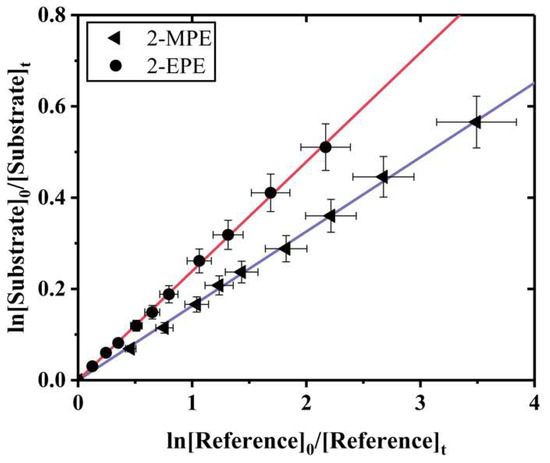 where [Substrate]0 and [Substrate]t are the concentrations of 2-MPE and 2-EPE at time t = 0 and time = t. [Reference]0 and [Reference]t are the concentrations of the reference compound at time t = 0 and time = t. A plot of ln([Substrate]0/[Substrate]t) versus ln([Reference]0/[Reference]t) should be a straight line passing through the origin and whose slope gives the ratio of rate coefficients kS/kR. Each reaction studied was measured relative to the reactions of different reference standards.