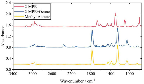 Infrared spectra of the detected products in the reaction of 2-MPE with O3. The top line indicates the spectrum of 2-MPE at t = 0 h, the middle line represents the spectrum of 2-MPE at t = 2 h and the bottom line is the standard methyl acetate.