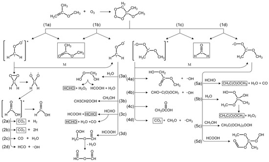 As can be seen in Scheme 1, the reaction of 2-MPE with O3 pursued by O3 electrophilic addition on the double bond and accordingly led to the formation of the primary ozonide, which has been proved to form in similar reactions in our previous study [57]. Primary ozonide could rapidly decompose by two pathways: the first one is decomposition to CH3C(O)OCH3 and a Criegee intermediate ([CH2OO]*), and the second is the formation of another Criegee intermediate ([CH3OC(CH3)OO]*) and HCHO. The rates of these two pathways were rapid and the products were barely detected by matrix isolation technique [57]. Both Criegee intermediates could undergo collisional stabilization and thus are formed in either excited or stabilized forms, resulting in a total of four decomposition channels for the reaction. The excited forms were proposed to have a number of different decomposition and/or rearrangement pathways. [CH2OO]* could form dioxirane and rapidly recombine to excited formic acid, therewith decomposing to OH and some small molecules such as CO2 and CO. HCOOH and formaldehyde are both reaction partners for Criegee biradicals in Reactions (3c), (3d), (5a) and (5d) in Scheme 1. These paths can become important sinks if a sufficient amount of Criegee biradicals and formaldehyde have been formed. Reactions (5a) and (5b) may form additional methyl acetate in the presence of HCHO and H2O and lead to higher yield than from Reactions (1a) and (1b) alone. This assumption could be verified by the intense IR vibration of methyl acetate in Figure 3. The branching ratio of the decomposition of the primary ozonide is usually close to 1:1 for n-alkyl substituted alkenes. In contrast, bulky or branched-chain substituted alkenes would preferably lead to the formation of the longer carbonyl (such as methyl formate) and the shorter Criegee biradical (i.e., [CH2OO]*) [25]. This rule implies that the effect of the methoxy substitution is similar to that of a bulky or branched substituent. Similar results were observed in previous studies of the ozonolysis of linear vinyl ethers, where Reactions (1a) and (1b) could account for 60–80% of the total decomposition of the primary ozonide [18,25,28,29]. However, no direct evidence of the branching ratios for the formation of the excited or stabilized Criegee biradicals could be inferred from the present study. In conclusion, the four types of Criegee intermediates formed in the ozonolysis of 2-MPE can undergo a variety of further reactions, and all possible pathways are summarized in Scheme 1.