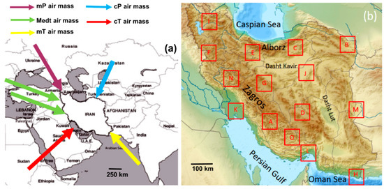 (a) Air masses influencing Iran and (b) spatial distribution of the 15 studied locations. (Shiraz (A), Mashhad (B), Shahrood (C), Rafsanjan (D), Hashtgerd (E), Marivan (F), Isfahan (G), Chabahar (H), Tabriz (I), Tabas (J), Ahvaz (K), Bandar Abbas (L), Zabol (M), Khoram Abad (N), and Darab (O)).