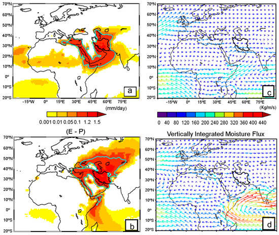 Seasonal pattern of (E-P) > 0 (mm/day) backward integrated from Iran along 10 days for wet (November to April) (a) and dry (May to October) (b) seasons. The light blue line (p95 value) shows the boundaries of the sources and vertically integrated moisture flux (vectors in kg m−1 s−1) for wet (c) and dry (d) seasons (data obtained from ERA-Interim).