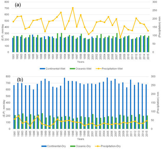 Oceanic and continental (E-P) > 0 (mm/day) values and precipitation amounts over Iran for the wet (a) and dry (b) seasons between 1981 and 2015.