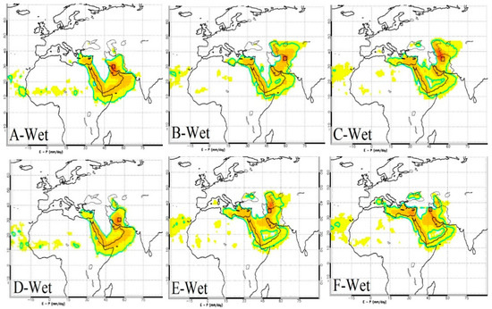 The climatological field of (E-P) > 0 obtained by the analysis of backward trajectories of air masses arriving over Iran for the wet and dry seasons from 1981 to 2015 (Figure 2a,b) shows the locations of the main moisture sources and spatial extension changes between the two seasons. Moisture uptake mainly occurs in the south, southwest, and west of Iran in the wet season (Figure 2a) and in the west and northeast in the dry season (Figure 2b). In Figure 2a,b, light blue line represents the 95% percentile (p95) of annual (E-P) > 0 values; within the line are the 5% of grid points with the highest (E-P) > 0 values of the map which correspond to the (E-P) > 0 values of 0.12 mm/day and 0.15 mm/day for the wet and dry seasons, respectively. Although choosing a contour line is arbitrary, it should not be so large as to include regions with minor effects on precipitation or so small as not to include regions which have a notable effect on precipitation [28,35].