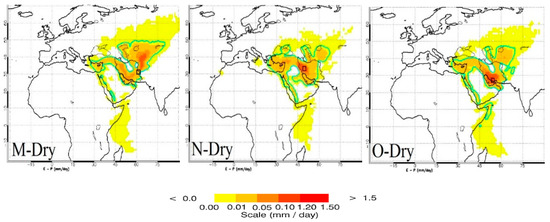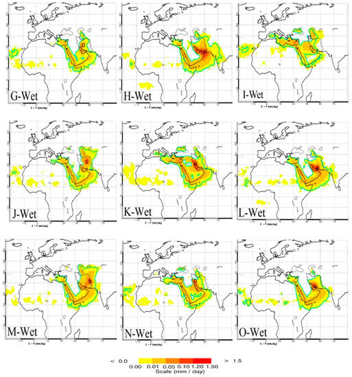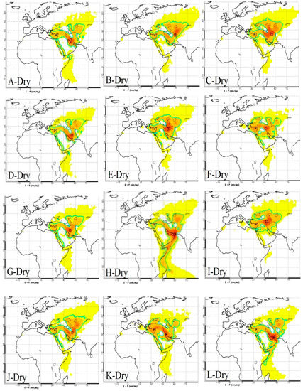 The summation of (e − p) values of all particles in the atmospheric column over an area results in the net fresh water flux (E-P) of the related particles, where (E) represents evaporation and (P) represents precipitation per unit area. Along the backward trajectories, the (E-P) > 0 values indicate regions where evaporation exceeds precipitation, allowing one to identify where the air masses gain their moisture. On the contrary, (E-P) < 0 values demonstrate regions where precipitation dominates evaporation and are considered as moisture sinks [19,20]. As the aim of this study is to determine the moisture sources, only positive values of (E-P) have been considered. The (E-P) > 0 values have been calculated for both continental and oceanic moisture sources. The moisture uptake from each oceanic sources has been calculated by masking each waterbodies area from the oceanic (E-P) > 0 map. Then, using each waterbody’s (E-P) > 0 map and amassing (e-p) for all the particles residing in the atmospheric column over an area, (E-P) values for each oceanic source have been calculated. As the locations of the continental moisture sources cover a vast area in both the dry and wet periods, the roles of each land use in providing moisture have been considered using a global land use map (1 × 1 degree) from The Global Land Cover Facility [34]. For continental sources, calculating (E-P) values for each source has been the same as oceanic sources. The area of continental (E-P) > 0 map has been masked from the global land use map. Then, using each land use (E-P) > 0 map and adding (e-p) for all the particles in the atmospheric column over an area, continental (E-P) value for each land use has been determined.