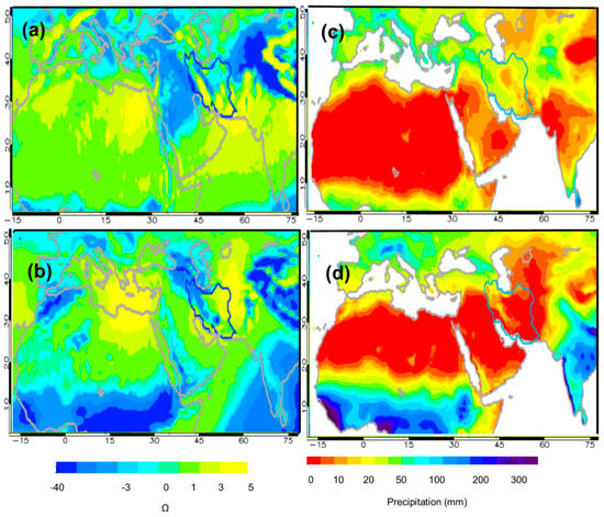 The stability of atmosphere (Omega ω) variations (a,b) and precipitation distribution (c,d) over Iran and nearby regions for wet and dry seasons, respectively (1981–2015).
