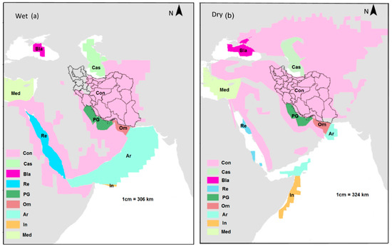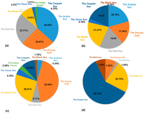 The contribution percentage of oceanic and continental moisture sources in the dry and wet season is presented in Table 1. The results are in agreement with some previous studies [6,18] using old and traditional meteorological methods. Alijani [6] believed that the Mediterranean Sea is the dominant moisture source of Iran’s precipitation. In contrast, Karimi and Farajzadeh [18] believed that the Arabian Sea with a share of 39% and the Mediterranean Sea with a share of 38% are the dominant providers of Iran’s total moisture, while the Red Sea (6.8%), the Oman Sea (4.8%), the Caspian Sea (4.4%), the Persian Gulf (3.7%), and the Black Sea (3.3%) have a minor contribution.