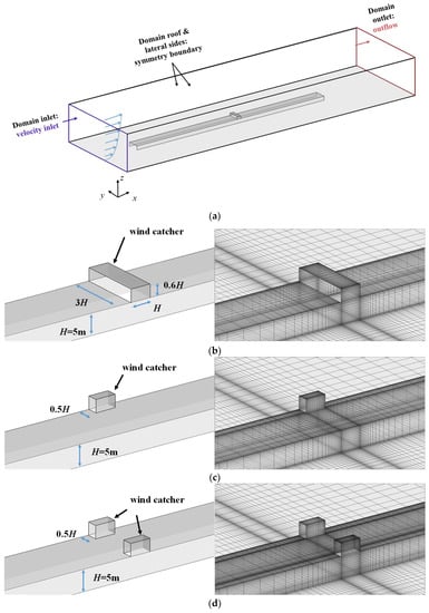 The tunnel model was built on a 1:1 real scale in accordance with the real-world vehicle-pedestrian tunnel in the Barbican district, City of London, UK. The tunnel height is H = 5 m and the length of the tunnel is L = 270 m. The long catcher was designed to be 3 m tall (0.6H) and 5 m wide (H) with a length of 15 m (3H) (Figure 2b). Meanwhile, the short catcher was designed to be 2.5 m in length (Figure 2c). The thickness of the building was neglected to reduce the mesh number and improve the computational efficiency due to its relatively small influence on flow at this scale, which was confirmed in some pre-modeling tests in this research (Figure A1 and Figure A2). The preliminary test is specifically discussed in Appendix A.