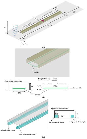 (a) Physical model and boundary condition setups in tunnel-catcher simulation cases. Model and grid distribution of (b) single long-catcher cases; (c) single short-catcher cases and (d) double short-catcher cases; (e) setup in computational domain; (f) source setup in cases; (g) setup of pedestrian regions.