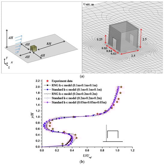 The natural ventilation feature of the wind catcher was validated by a wind tunnel experiment by Jiang et al. [42]. A 10:1 3D cubic building model with two openings was built, with the scale similar to the catcher-tunnel models. The corresponding parameters of the building model are presented in Figure 2a, i.e., building height of 2.5 m and opening size of 0.84 m wide and 1.25 m tall. At the domain inlet, the vertical profiles of the stream-wise velocity and turbulent quantities are defined as follows [43]: