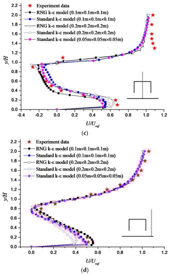 Normalized wind speed profile (U/Uref) of three feature lines x = −25/H, H/2 and 3H/2 at the center plane of the model are presented in Figure 3b–d respectively. Results show that both the RNG k-ε model and the Standard k-ε model predict the flow well in the cross ventilation cases, with the profiles generally fitting the experiment data. For better evaluation of the model simulation accuracy, a series of statistical values were calculated, including normalized mean error (NMSE), the fraction bias (FB) and the correlation coefficient (R). The results of the statistical metrics are listed in Table 2. According to Santiago et al. [47], a credible simulation model should satisfy the criterion of the statistical metrics: NMSE ≤ 1.5 and −0.3 ≤ FB ≤ 0.3. All of the correlation coefficients were significant with 95% confidence. Data shows that all of the statistical values satisfy the criterion, while both the RNG k-ε model and the Standard k-ε model could predict the flow with an acceptable accuracy. The medium grid attains some different CFD results from the coarse grid, but CFD results change little if the fine grid is used (Figure 3b–d, Figure 4). Thus, the medium grid arrangements with a minimum grid of 0.1 were adopted for the following CFD simulations. In addition, the standard k-ε model was employed in our study owing to it being the most widely adopted and accurate predictor validated by the literature [21,23,25,33].