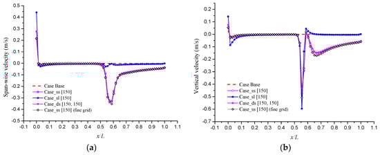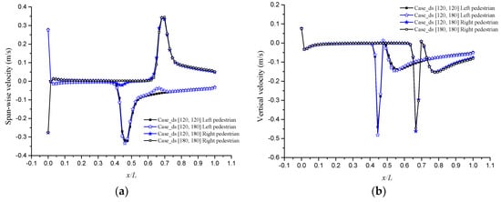 Span-wise velocity and vertical velocity along left pedestrian side in Case_ss [150] and Case_ss [150] (real shape). (a) Span-wise velocity; (b) vertical velocity.
