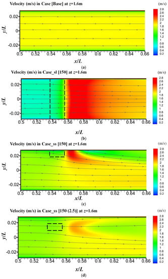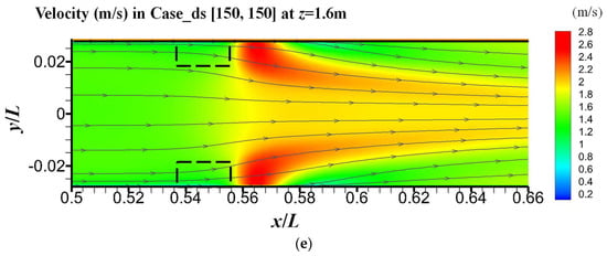 Velocity magnitude with streamtrace on horizontal cross section from 135 m (x/L = 0.5) to 178 m (x/L = 0.66) at pedestrian level (z = 1.6 m). (a) Base Case; (b) Case_sl [150]; (c) Case_ss [150]; (d) Case_ss [150, 2.5]; (e) Case_ds [150, 150].