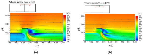 Velocity magnitude with streamlines in (a) Case_sl [150] and (b) Case_ss [150] on a vertical cross section at the central left-pedestrian region.
