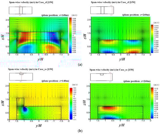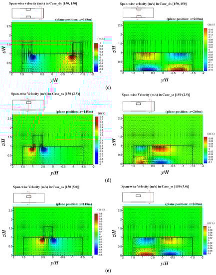 Span-wise velocity on a vertical cross section at x = 148 m (x/L = 0.54) and x = 260 m (x/L = 0.96) respectively. (a) Case_sl [150]; (b) Case_ss [150]; (c) Case_ds [150, 150]; (d) Case_ss [150 (2.5)]; (e) Case_ss [150 (5.0)].