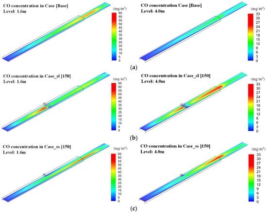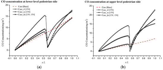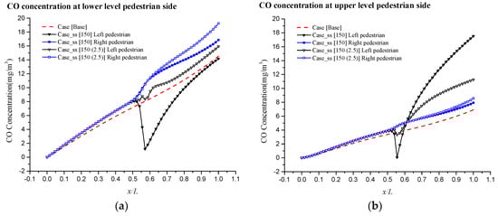 CO concentration in Case_ss [150] and Case_ss [150 (2.5)] at: (a) Lower level pedestrian side and (b) upper level pedestrian side.