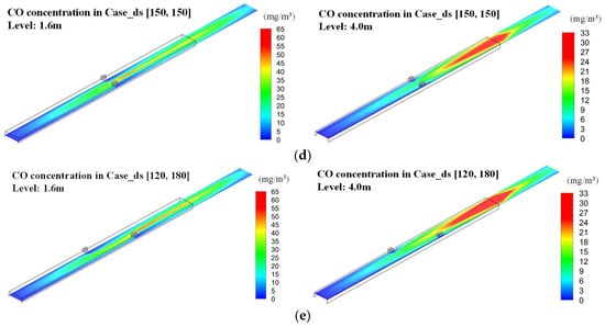 Figure 9e presents the CO concentration in the staggered arrangement case (Case_ds [120, 180]) at two different layers, where significant asymmetrical distribution of CO could be found. A much clearer low-concentration band exists on the right pedestrian side at z = 1.6 m, but more pollutants accumulate at the upper level of the tunnel compared with the results in Case_ds [150, 150] (Figure 9d).