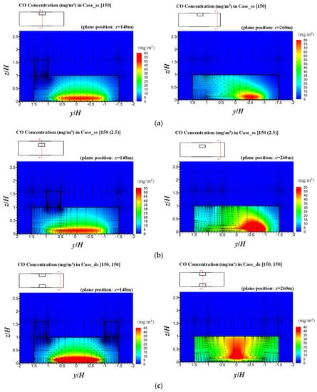 CO concentration on vertical cross section at x = 148 m (x/L = 0.54) and x = 260 m (x/L = 0.96) respectively. (a) Case_ss [150]; (b) Case_ss [150 (2.5)]; (c) Case_ds [150, 150].