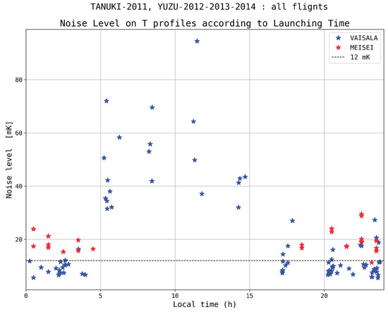 Figure 2 shows the mean noise levels according to the launching hour. It is obvious that daytime profiles are much noisier than night-time profiles since all daytime data have noise levels above 30 mK, while night-time data have noise levels below 30 mK. It is very likely that the excess noise during daytime is due to the effects of solar illumination on the temperature sensor coupled with its randomly varying orientation.