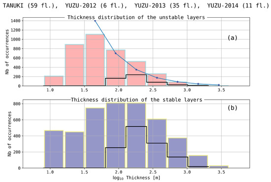 The distributions of the thickness h of the stable and unstable layers are examined. For the unstable layers, the distribution follows approximately a power law, varying as . Such a distribution does not appear to be universal. For the stable layers, no power law can be evidenced, a mode being observed for –200 m.