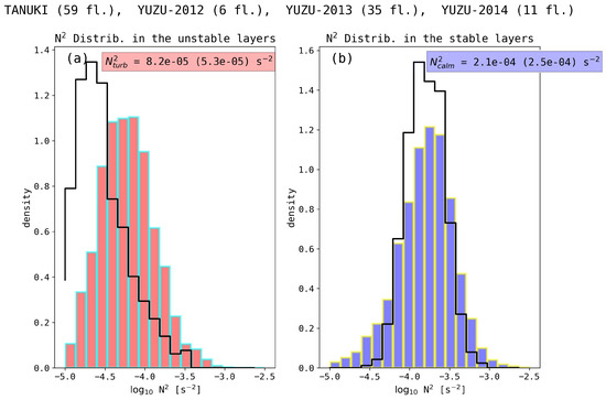 The vertical static stability of the layers is quantified through the squared BV frequency, . For every layer, unstable or stable, the vertical component of the gradient is estimated as the range of PT on that layer divided by its thickness. The empirical distributions of for the stable and unstable layers are observed to differ significantly since the mean of the stable layers is about 2.5 times larger than that of the unstable layers. The contrast is even larger (a factor of 5) for the selected layers (thicker than 200 m from the low noise level profiles). These findings show that the unstable layers selected by the Thorpe method have a lower vertical stability than the stable layers. Such a reduction in static stability is very likely the consequence of turbulent mixing.