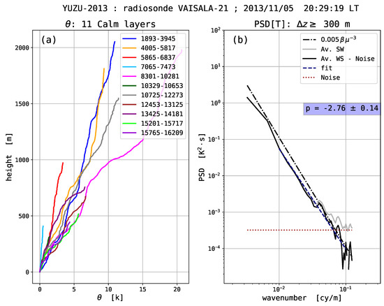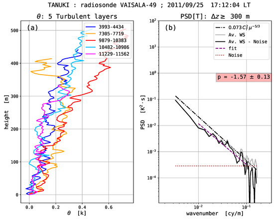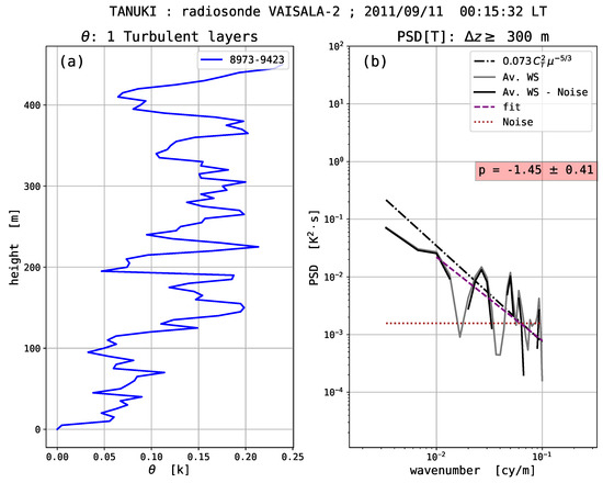 2] selected 101 layers in the upper troposphere-lower stratosphere. Their selection of layers was not based on the Thorpe method (although they estimated the Thorpe length within the selected layers), but on criteria such as (i) data segments at least 200 m long showing weak or intense variability in the velocity profile, (ii) the consistency of the velocity and temperature spectra, (iii) a nearly constant temperature gradient and (iv) the apparent homogeneity of the fluctuating profiles. These authors determined some statistical properties of these layers including power spectra and probability density functions (PDF). They show vertical power spectra scaled as either