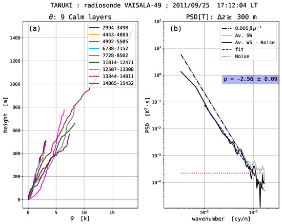 Such a spectral analysis of atmospheric layers according to their stability conditions suggests that the atmosphere is constituted of strata with distinct flow regimes. A remarkable finding is that no background turbulence is observed: in most of the stable layers for scales below the detection limit (∼30–50 m for the least noisy profiles), since no change in the spectral slope is visible (on the averaged PSDs). These stable layers show characteristics of a laminar flow, that is no instability, and steep power law spectra (∼), down to vertical scales of ∼10 m.