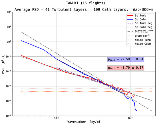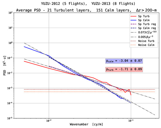 7]. The other regions do not show any PT inversions, or only a few inversions attributed to instrumental noise. These stably stratified regions will be called “calm” as opposed to turbulent ones. The power spectral density (PSD) of the temperature fluctuations are estimated for both the turbulent and calm regions.
