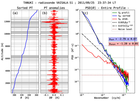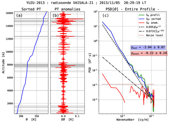 35]. It is the reference profile with respect to which the turbulent available potential energy (TAPE) created by the overturns (i.e., instabilities) in the flow is defined. This profile, which is stable everywhere (and will henceforth be referred to as an “everywhere-stable” PT profile), describes the state of vertical stratification of the atmosphere at a given moment. It is expected that the occurrence of turbulence leads locally in a reduction in static stability because of mixing. The spectral characteristics of the sorted PT profile therefore depend on the spatial distribution of layers with different static stability. These PSDs are found to be remarkably universal, varying as