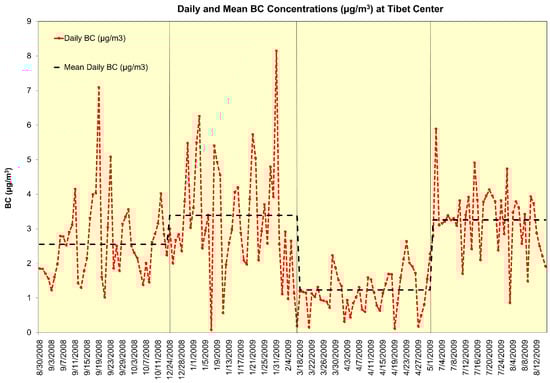Daily and mean BC concentrations (µg/m3) at Tibet Center during the study period.