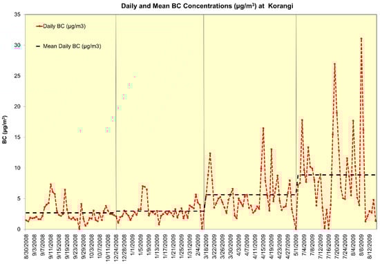 Daily and mean BC concentrations (µg/m3) at Korangi during the study period.