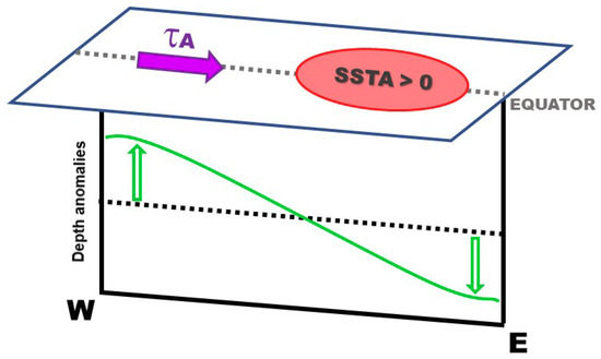 Sea surface temperature (SST) is an important indicator of climate variability. Its response to external forcings will depend on the intensity, duration, and spatial distribution of the perturbation. In the equatorial Atlantic Ocean, noticeable anomalies in SST are observed on interannual time scales. These anomalies reveal the Atlantic Niño mode [1,2], a tongue-shaped SST pattern related to equatorial zonal wind anomalies and thermocline depth changes via air–sea interaction processes. Positive feedback (Figure 1) may occur when the SST and thermocline depth changes in the eastern Atlantic are related to zonal wind anomalies in the western part of the basin [3,4,5]. The Atlantic Niño is known for influencing precipitation in West Africa and South America [6,7,8]. Positive SST anomalies in the eastern equatorial Atlantic increase the precipitation over Northeastern Brazil and western equatorial Amazon, whereas negative SST anomalies in the eastern equatorial Atlantic decrease the precipitation over the West African monsoon region. These patterns correspond to the Atlantic Niño phases and are associated with changes in strength and meridional displacement of the Intertropical Convergence Zone (ITCZ), in intensity of tropical convection, and in magnitude of the westerlies [7,9,10,11,12].