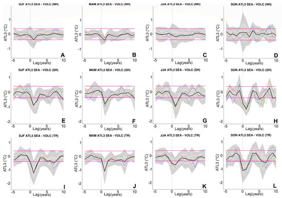 VOLC SEA for ATL3 SST seasonal anomalies (°C), calculated considering the volcanic eruptions listed in Table 1, for five years before the eruption, and ten years after the eruption. Horizontal: class of the eruptions (NH—(A–D); SH—(E–H); and TR—(I–L)); Vertical: seasonal SEA seasonal SEA (December to February—DJF; March to May—MAM; June to August—JJA; and September to November—SON). Lines in colors correspond to the individual ensemble members, and black thick line refers to the ensemble mean. Light shaded gray corresponds to one standard deviation, and dark shaded gray corresponds to two standard deviations. Magenta solid line corresponds to one standard deviation of the CTRL run.