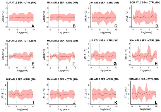 CTRL SEA for ATL3 SST seasonal anomalies (°C), calculated after list of volcanic eruptions in Table 1, for five years before the eruption and ten years after the eruption. Horizontal: class of the eruptions (NH—(A–D); SH—(E–H); and TR—(I–L)); Vertical: seasonal SEA (December to February—DJF; March to May—MAM; June to August—JJA; and September to November—SON). Dark red line corresponds to the CTRL run, and light shaded red corresponds to one standard deviation of the CTRL run.