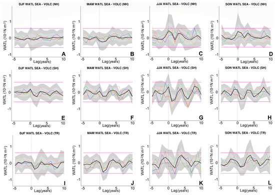 VOLC SEA for WATL wind stress seasonal anomalies (10−2 Nm−2), calculated considering the volcanic eruptions listed in Table 1, for five years before the eruption and ten years after the eruption. Horizontal: class of the eruptions (NH—(A–D); SH—(E–H); and TR—(I–L)); Vertical: seasonal SEA (December to February—DJF; March to May—MAM; June to August—JJA; and September to November—SON). Lines in colors correspond to the individual ensemble members, and black thick line refers to the ensemble mean. Light shaded gray corresponds to one standard deviation, and dark shaded gray corresponds to two standard deviations. Magenta solid line corresponds to one standard deviation of the CTRL run.