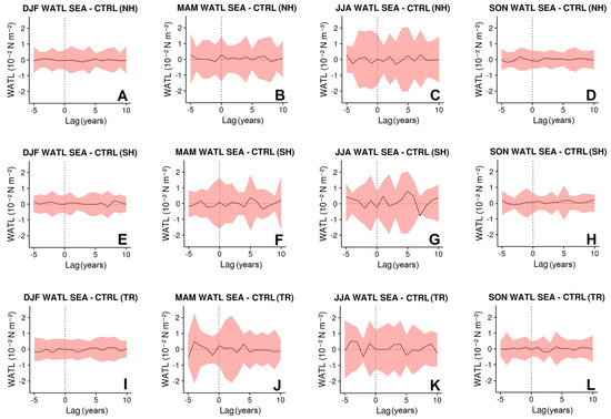 CTRL SEA for WATL wind stress seasonal anomalies (10−2 Nm−2), calculated after list of volcanic eruptions in Table 1, for five years before the eruption and ten years after the eruption. Horizontal: class of the eruptions (NH—(A–D); SH—(E–H); and TR—(I–L)); Vertical: seasonal SEA (December to February—DJF; March to May—MAM; June to August—JJA; and September to November—SON). Dark red line corresponds to the CTRL run, and light shaded red corresponds to one standard deviation of the CTRL run.